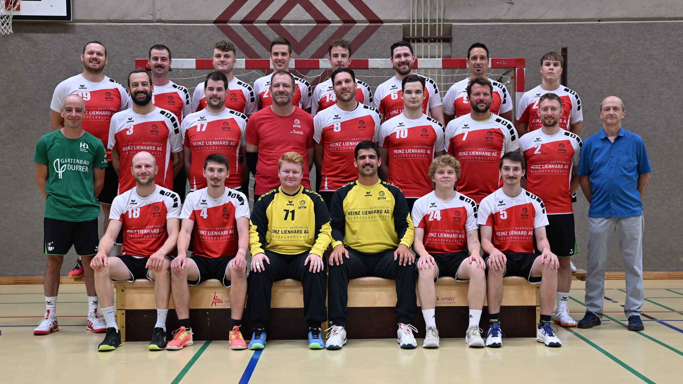 Mitte v.l.: Phillip Hofstetter (Trainer), Rafael Zilic, Markus Winkelmann, Simon Pauli, Res Beck, Louis Schomburg, Manuel Akermann, Lukas Lüthi, Thomas Lienhard (Dresssponsor)